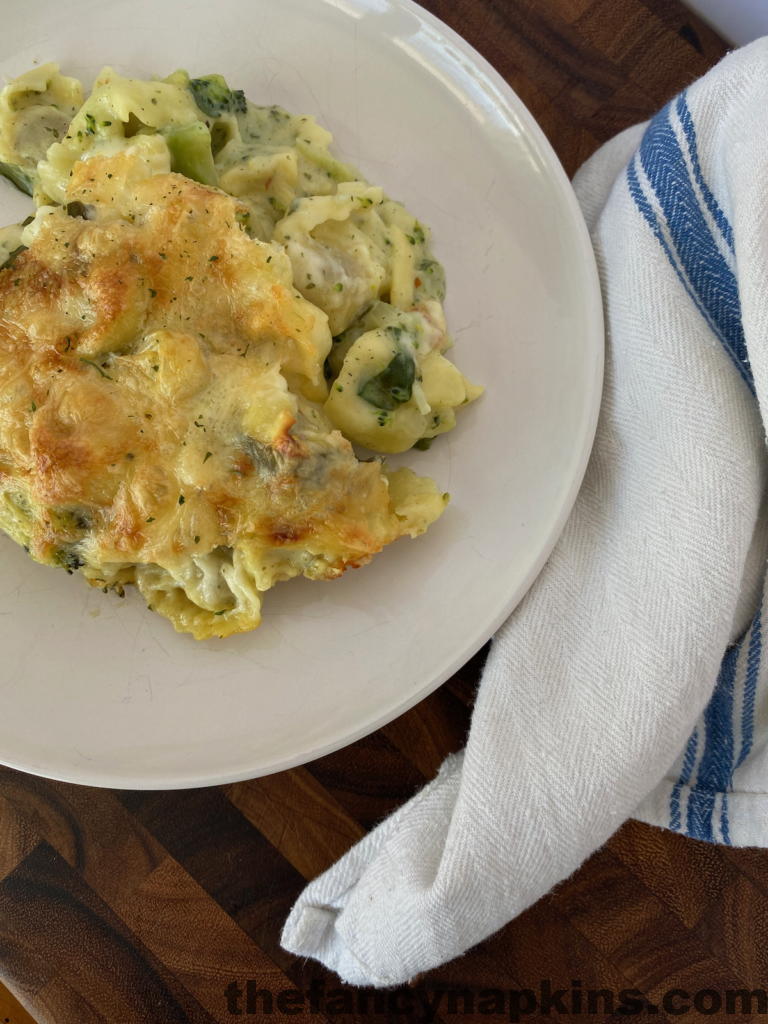 Thanks to an Instagram poll win, today I am sharing The Fancy Napkins’ Baked Alfredo. I used tortellini, but the beauty of this recipe is that you can use your own favourite pasta. Gnocchi would be amazing here too!
